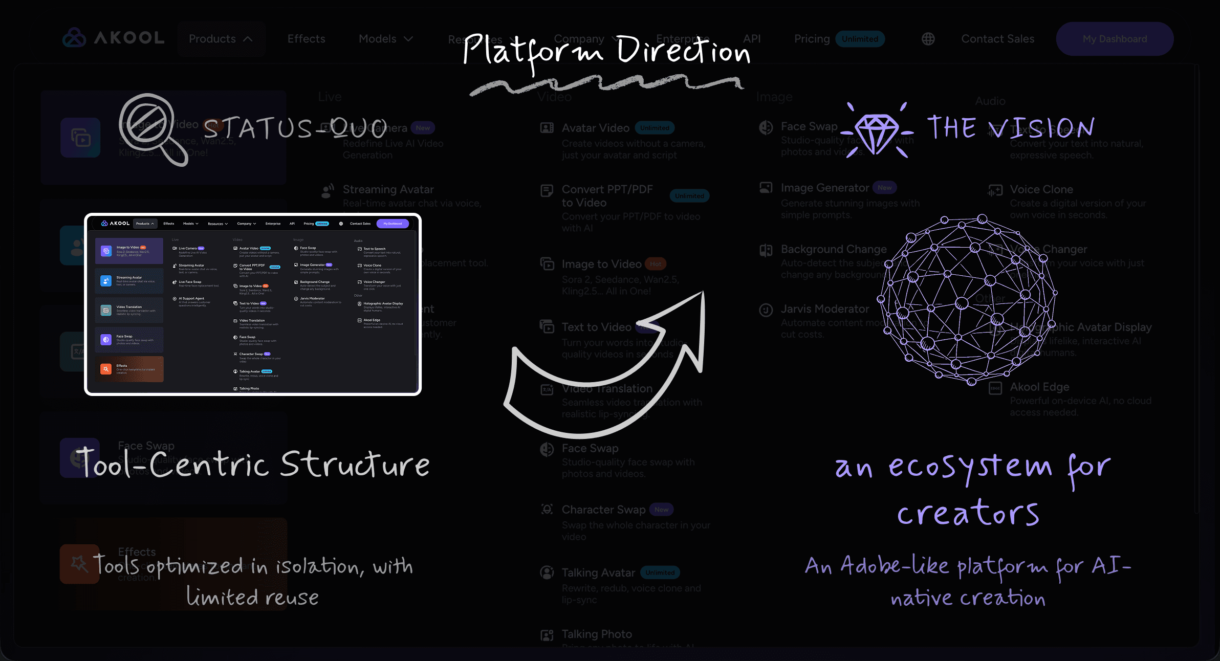 Designed for a simple “upload → generate” workflow, IG 1.0 lacked the architecture needed for Akool’s fast expansion into a multi-model, multi-tool ecosystem.