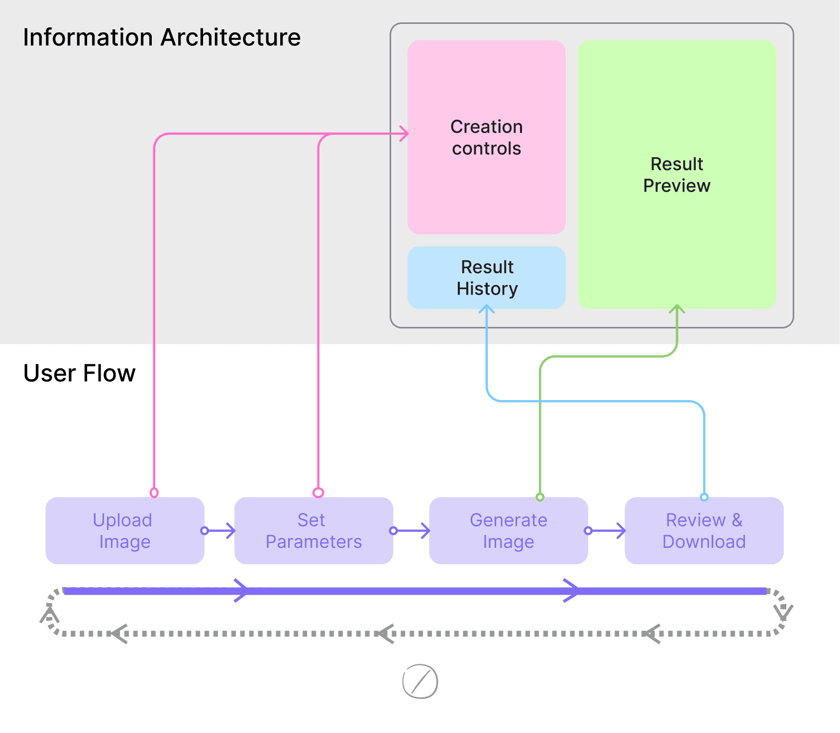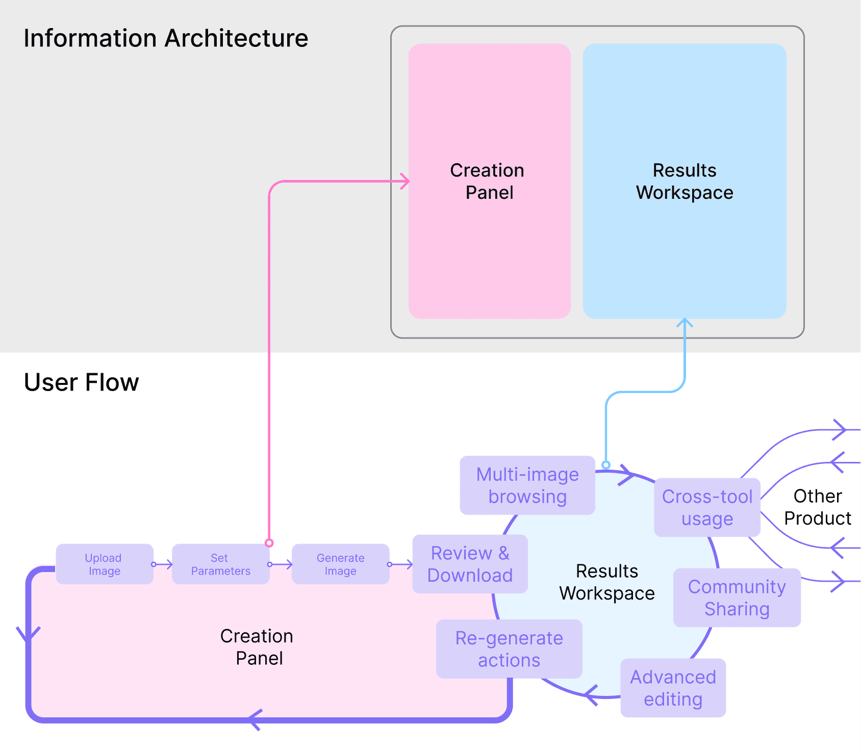 Because the IA was tightly coupled to a linear, step-by-step user flow, users were forced down a single path—making iteration, result comparison, and reuse increasingly difficult as new features were added.