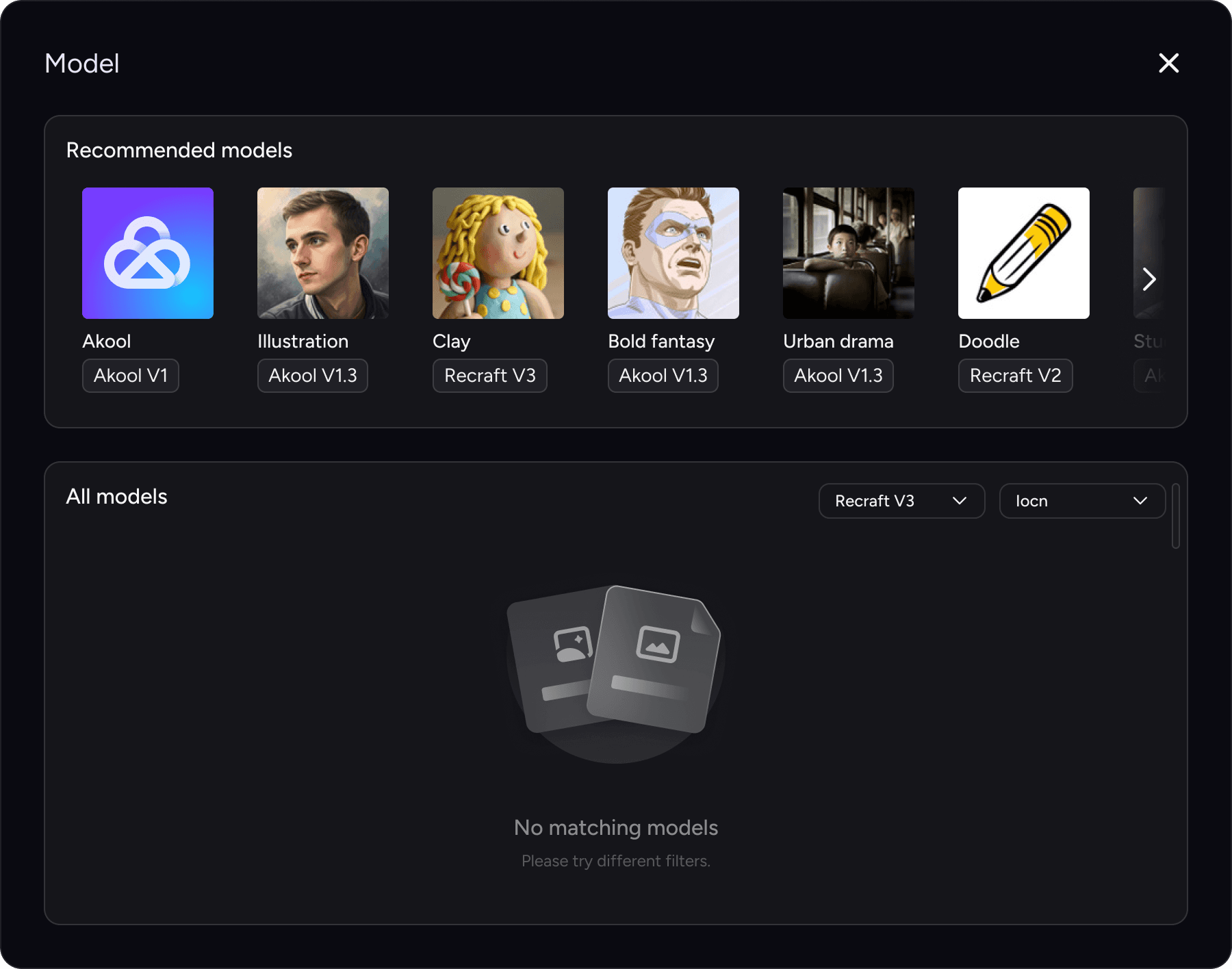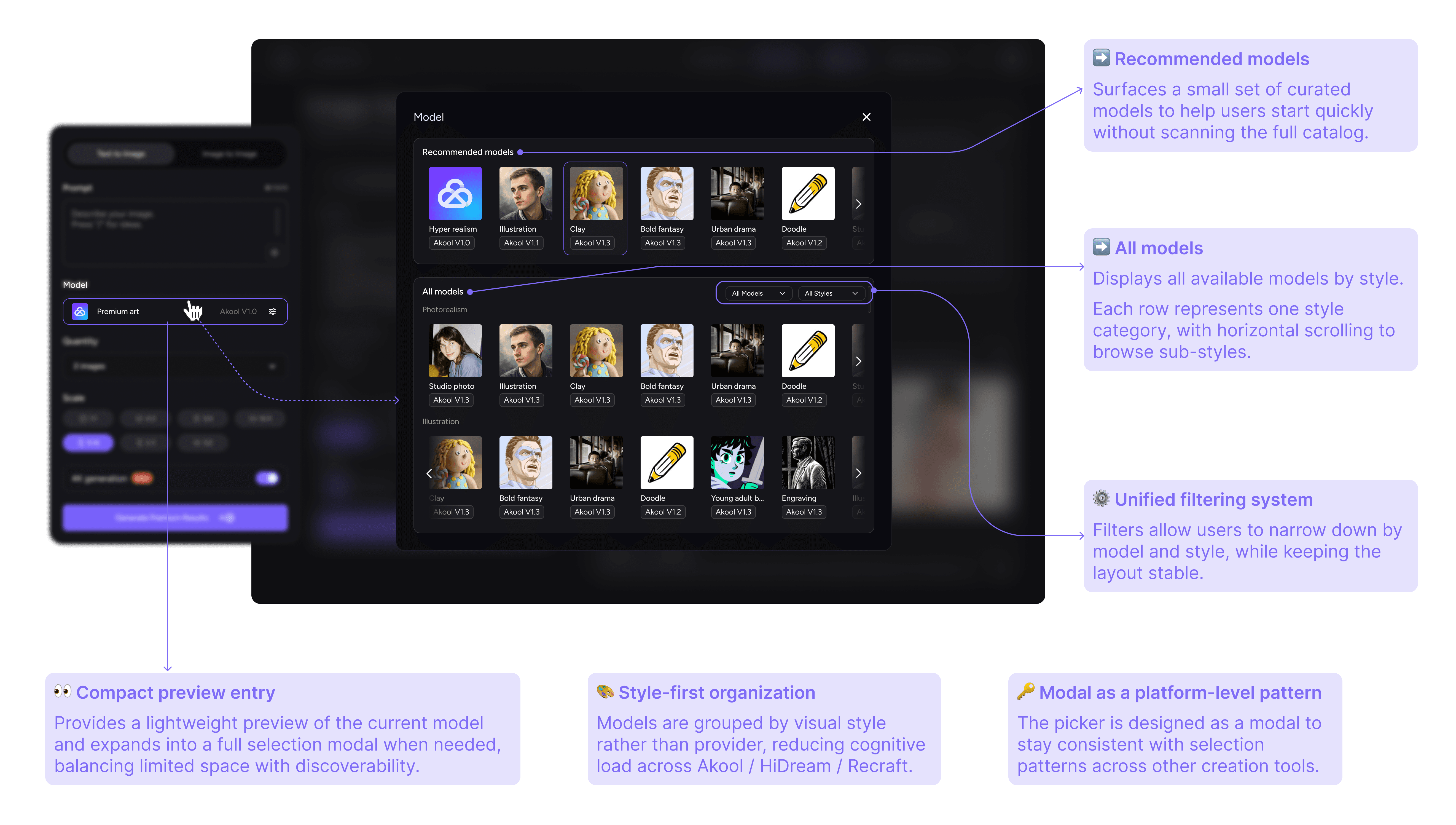 This introduced significant asymmetry. Recraft alone added over 100 models with different styles, while others offered only a few—making a flat, model-first list difficult to scale without overwhelming users.