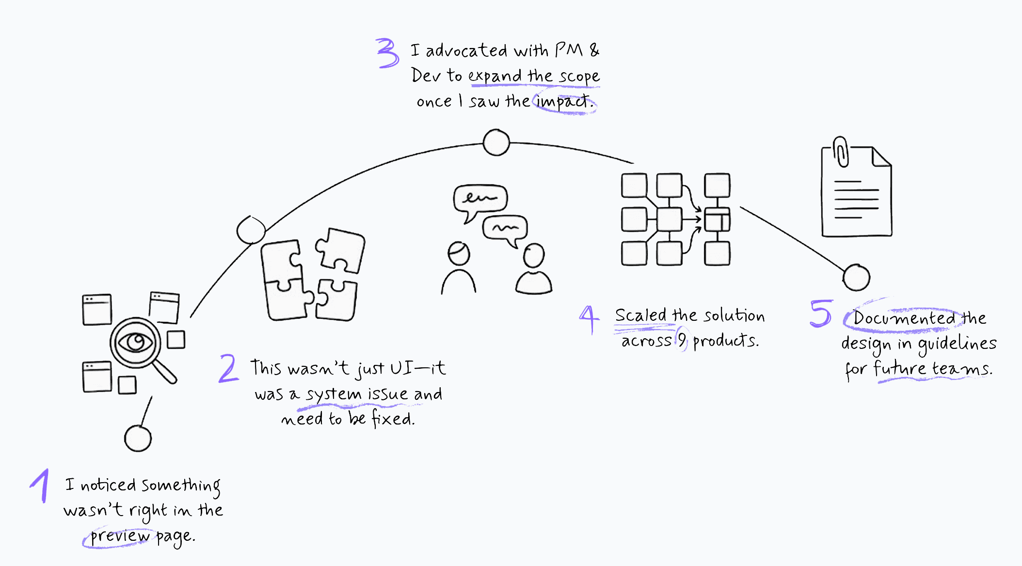 Although Preview wasn’t in my scope, the gap would limit future scalability — so I dug deeper instead of designing around it. What looked like a UI issue turned out to be a missing platform pattern.