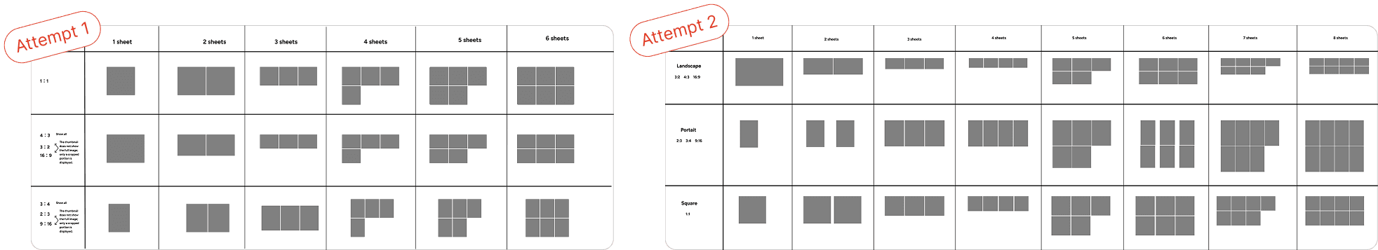 At first, I tried to design a perfect grid solution. As shown in the attempts below, I mapped out layouts that could handle every combination of image count and aspect ratio.