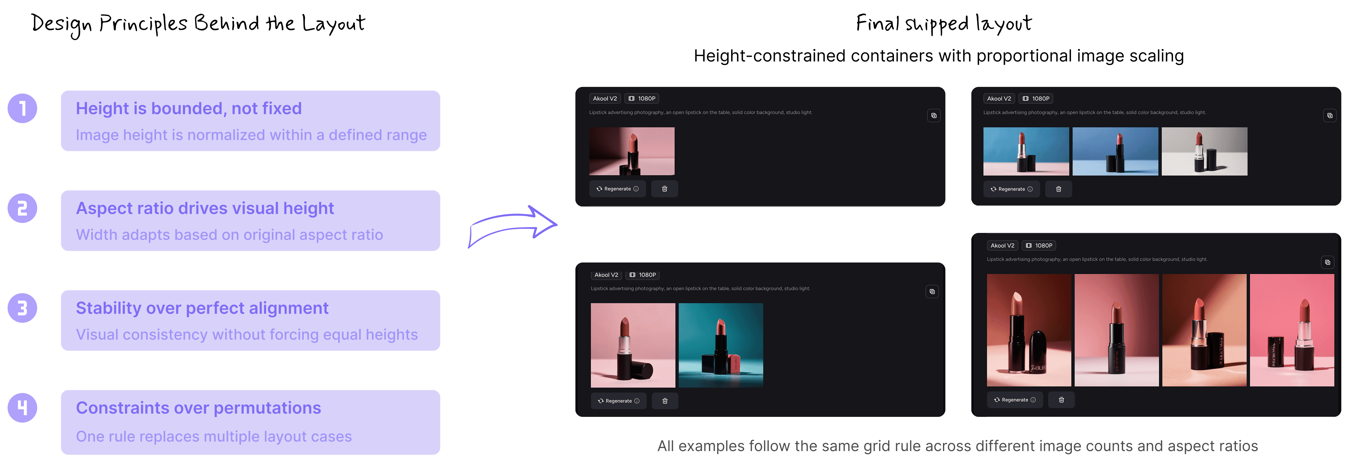 When redesigning the generation history, the core challenge was maintaining clarity as image count and aspect ratios varied.